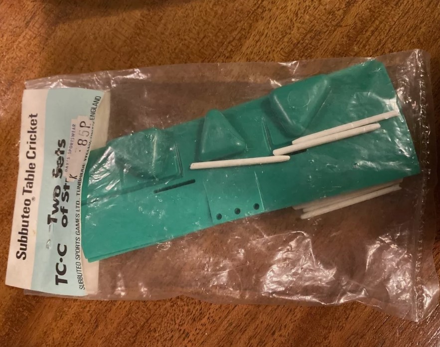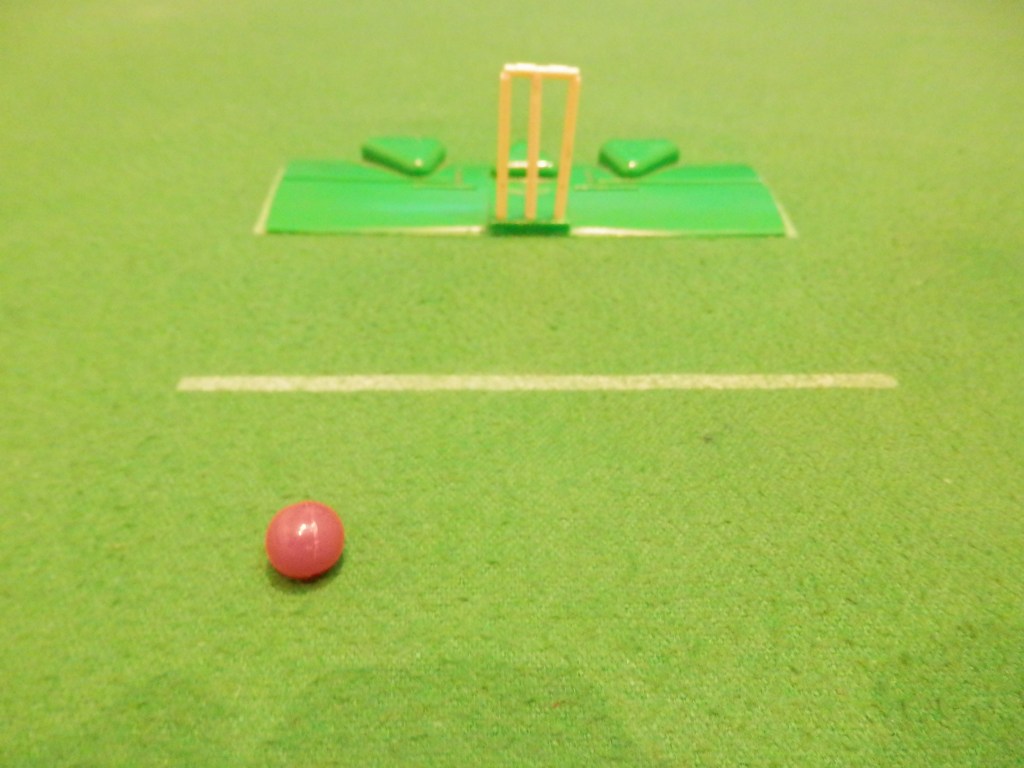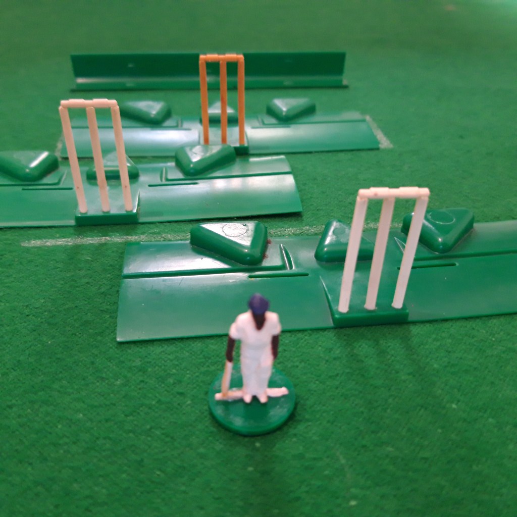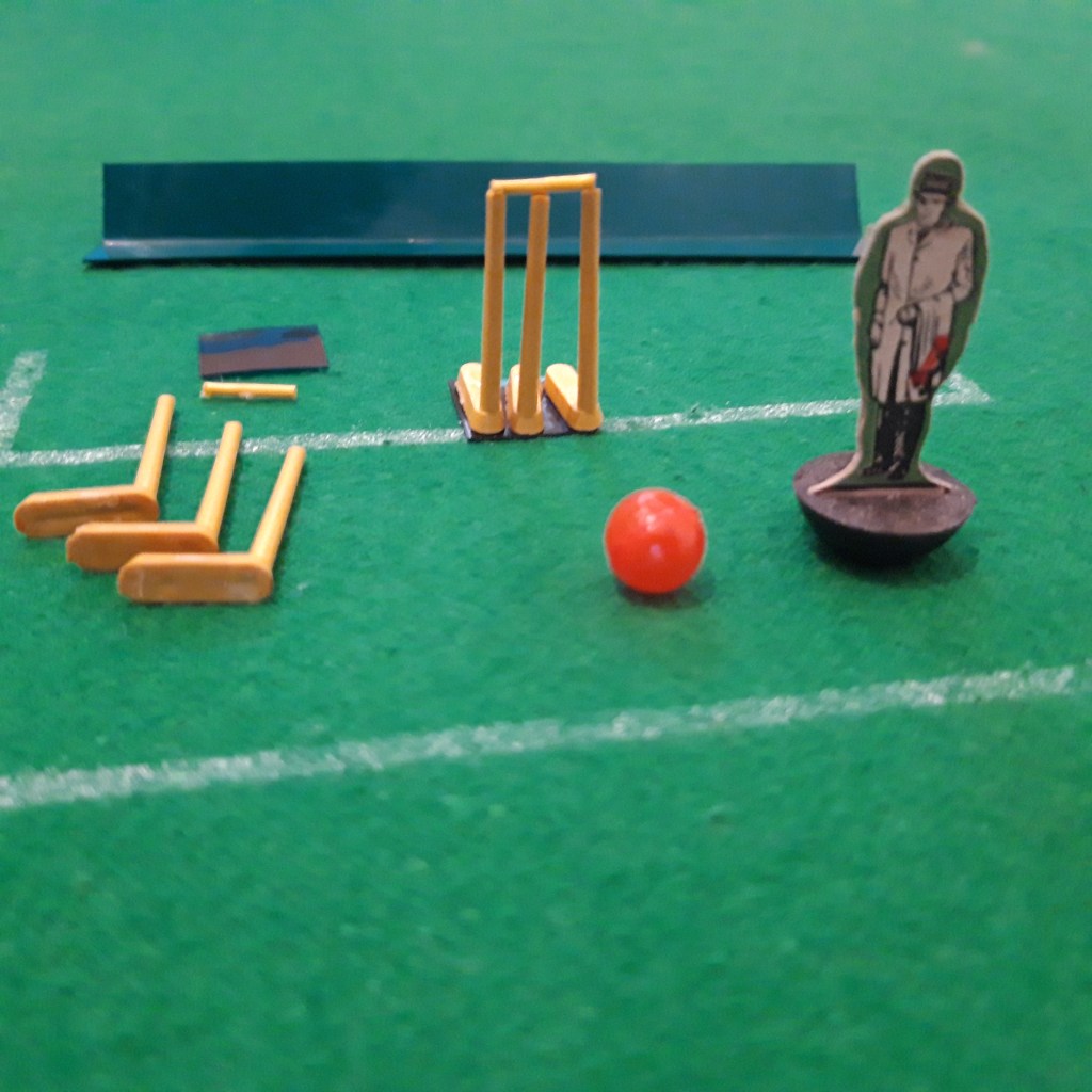In the flat era Set 6 consisted of two sets of stumps, bails and rests (the small dark squares below left). The stumps were free standing and are very fiddly to set up. The bails are so tiny they are often missing from sets and are one of the less common pieces to be able to buy nowadays.